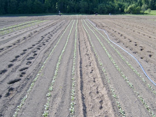 En 2012, nous avions alors 100 clients et nous avons redoublé d'efforts afin de cultiver cette nouvelle terre qui avait besoin d'un peu d'amour. L'achat d'un tracteur nous a aidé pour les gros travaux mais tout est encore fait à la main. Nous avons pu voir dès la première année les effets du drainage effectué à l'automne. Cependant, nous avions seulement pu drainer un peu moins de la moitié des champs. Nous avons donc concentré la production sur les parties moins humides. Au cours de l'été, nous avons pu constater que 2011 n'était pas une année d'exception, la pression d'insecte ravageur est bien plus importante dans Lotbinière qu'elle l'était en Mauricie. Nous avons donc commencé à acheter davantage de filets anti-insectes et à adapter nos méthodes de cultures. La saison terminée, nous avons fait niveler le champ au GPS, en vue de terminer le drainage lorsque nous le pourrons.